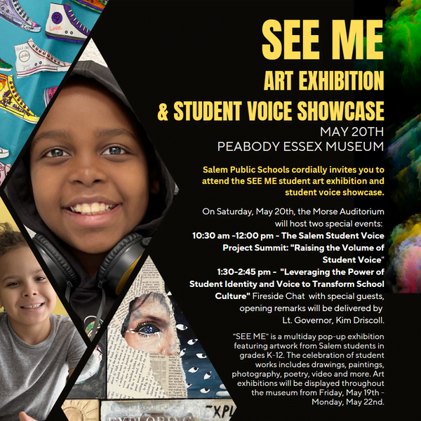 | SEE ME: A Celebration of Salem Public Schools Students at the Peabody Essex MuseumJoin the community for a celebration of Salem students at the Peabody Essex Museum from May 19-22! “SEE ME” is an initiative through the Salem Public Schools Office of Public Relations that captures the district’s core values of belonging, equity, and opportunity through the expression of student voices. This public exhibition at a world-renowned museum aims to share elements of how the young people of Salem see their history and how their cultures have shaped them. It explores how they see themselves walking through the world in the present and how they can influence the future. “SEE ME” is a multiday pop-up exhibition featuring artwork from Salem students in grades K-12. This celebration of student works includes drawings, paintings, photography, poetry, video and more. Works will be displayed throughout the museum. Join us for these special events on Saturday, May 20th: 10:30 am -12:00 pm – Morse Auditorium Salem Student Voice Project Summit: “Raising the Volume of Student Voice” Salem Public Schools has taken on the challenge of social inequity by forming a partnership with the nonprofit Equity Imperative. This partnership led to the creation of the Student Voice Project, an effort to amplify students’ concerns and help them take action to address them. 1:30-2:45pm – Morse Auditorium “Leveraging the Power of Student Identity and Voice to Transform School Culture” Fireside Chat with Superintendent, Dr. Stephen Zrike Jr, SPS Artist-in-Residence & Hip-Hop Performer, Dee-1, Equity Imperative Co-Founder and Director of the Student Voice Project, Judith Diaz-Rodriguez. Opening remarks from Lt. Governor, Kim Driscoll. Salem residents and SPS staff members will get in FREE! This is a wonderful opportunity to celebrate the incredible talent of Salem Public Schools students. Please come and join us at the Peabody Essex Museum any time next weekend. |  |