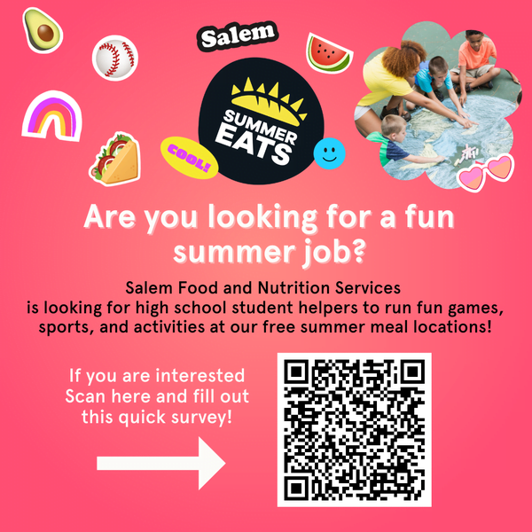 Are you a high school student looking for a fun summer job? Salem Food and Nutrition Services has a great employment opportunity for students this summer! We will be running a variety of fun activities at our dinner site location at Mary Jane Lee Park. These activities will range from arts & crafts to sports and lawn games! Students will be hired to help from 4pm-6pm on weekday evenings (M-F).