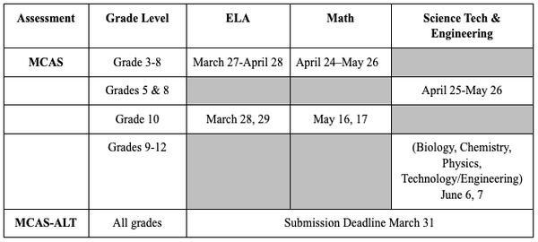 A Note From the SuperintendentMarch 17, 2023 Dear Salem families, It is MCAS season in Salem! All students in grades 3-8 and grade 10 in Salem will be taking the MCAS in English Language Arts (ELA) and math. Students in grades 5 and grade 8 will be taking the science, technology, and engineering MCAS. Depending on the science course that our high school students are taking, they might be assigned to take a biology, chemistry, physics, or technology/engineering MCAS this spring.